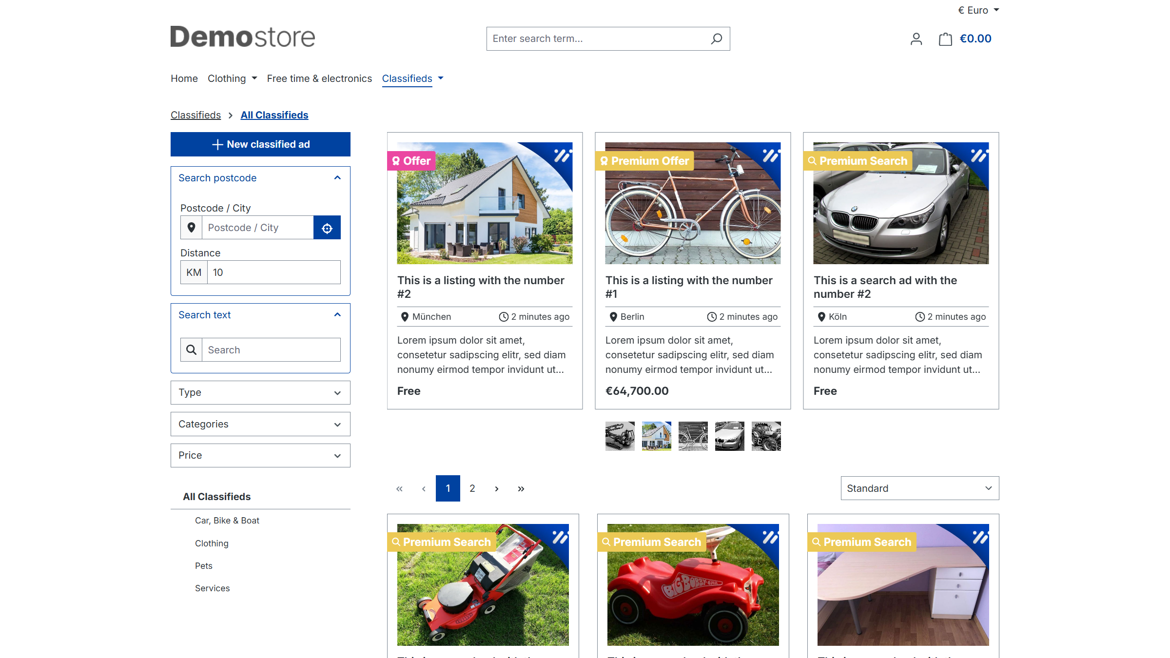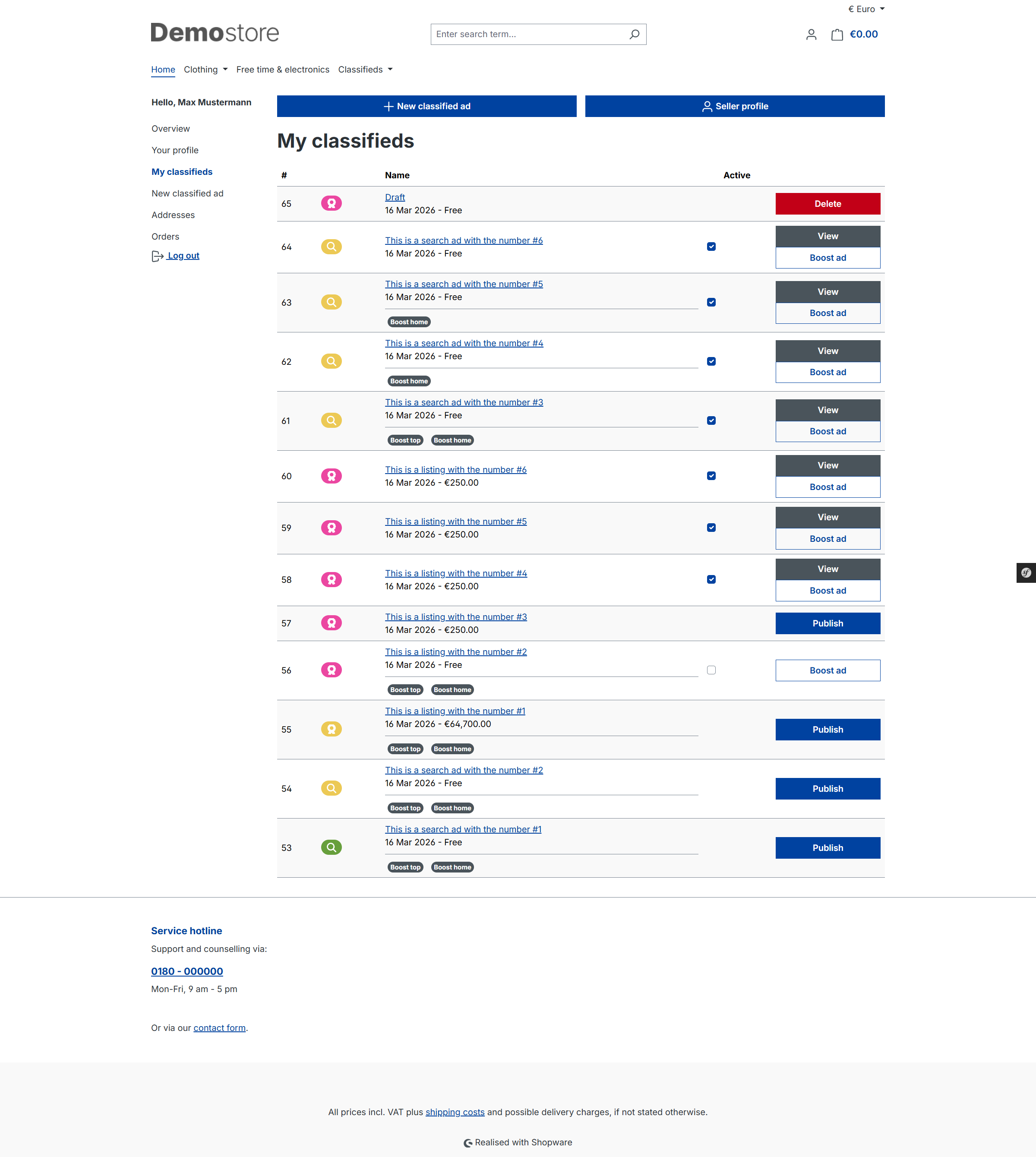 In der Übersicht (Kundenmenü Meine Kleinanzeigen) kann der Kunde seine Kleinanzeigen veröffentlichen oder unvollständige Kleinanzeigen löschen. Kostenpflichtige Anzeigen und Boosts werden erst freigegeben, wenn der Kunde diese Optionen bestellt und bezahlt hat.